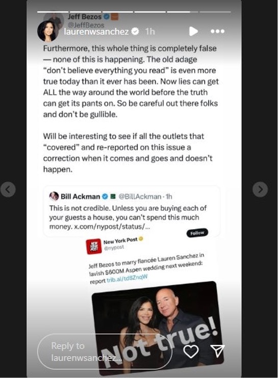 Lauren Sanchez echoed Bezos’ sentiments on her Instagram stories, sharing his post with a simple caption: “Not true.”