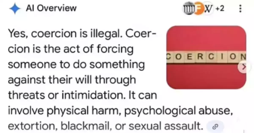 “Yes, coercion is illegal. Coercion is the act of forcing someone to do something against their will through threats or intimidation. It can involve physical harm, psychological abuse, extortion, blackmail, or sexual assault.”