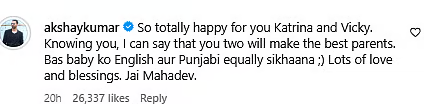 He added a playful twist to his wish: “Bas baby ko English aur Punjabi equally sikhaana 😉 Lots of love and blessings.” “Jai Mahadev.” The comment was an homage to their different ethnic backgrounds: Vicky is a proud Punjabi and Katrina is British.
