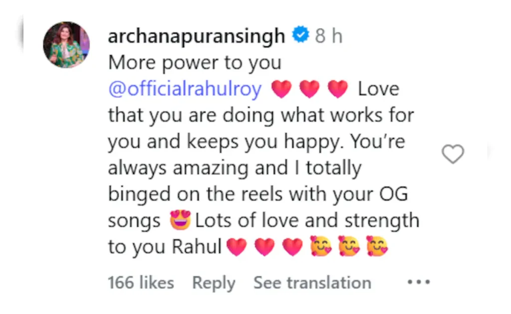 Among those backing him was Archana Puran Singh, who praised Roy for staying true to himself despite criticism. Responding to his post, she wrote, “More power to you… Love that you are doing what works for you and keeps you happy. You’re always amazing and I totally binged on the reels with your OG songs.”