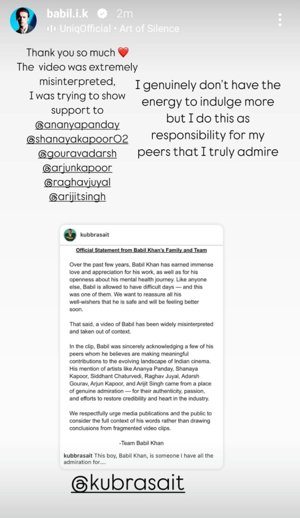 After deleting his account earlier in the day, Babil Khan says his emotional video praising peers was misunderstood; Siddhant Chaturvedi, Raghav Juyal, and others respond with support.