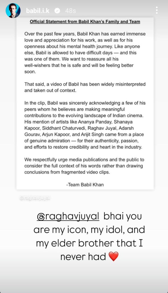 “In the clip, Babil was sincerely acknowledging a few of his peers whom he believes are making meaningful contributions to Indian cinema… His words came from a place of genuine admiration.”