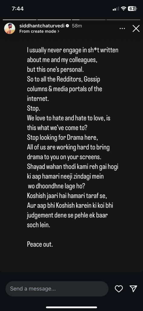 Siddhant later issued a note defending Babil, urging media and fans to stop seeking “drama” in actors’ personal lives: