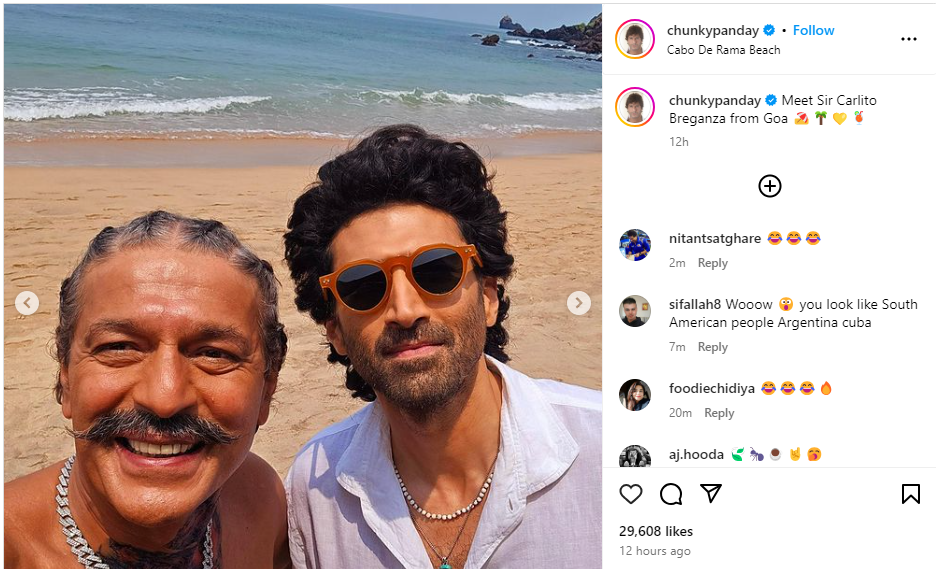 The photos, posted on Saturday, feature Chunky sporting a vibrant Goan look complete with braids, a moustache, and multiple chains. Aditya complemented the relaxed vibe in a lilac-hued shirt paired with a shell-chain and stylish brown-framed dark glasses. The duo looked effortlessly cool as they smiled for a selfie.