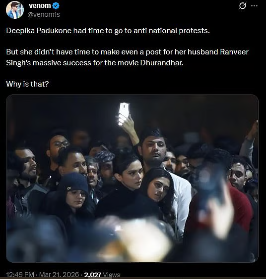 Bollywood actress Deepika Padukone is facing criticism on social media after not sharing any post about her husband Ranveer Singh’s latest film Dhurandhar: The Revenge, which released on March 19, 2026.