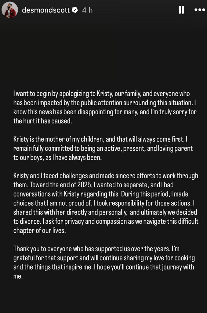 Taking to his Instagram Stories, Desmond issued a lengthy and emotional statement addressing the allegations and the future of their family.