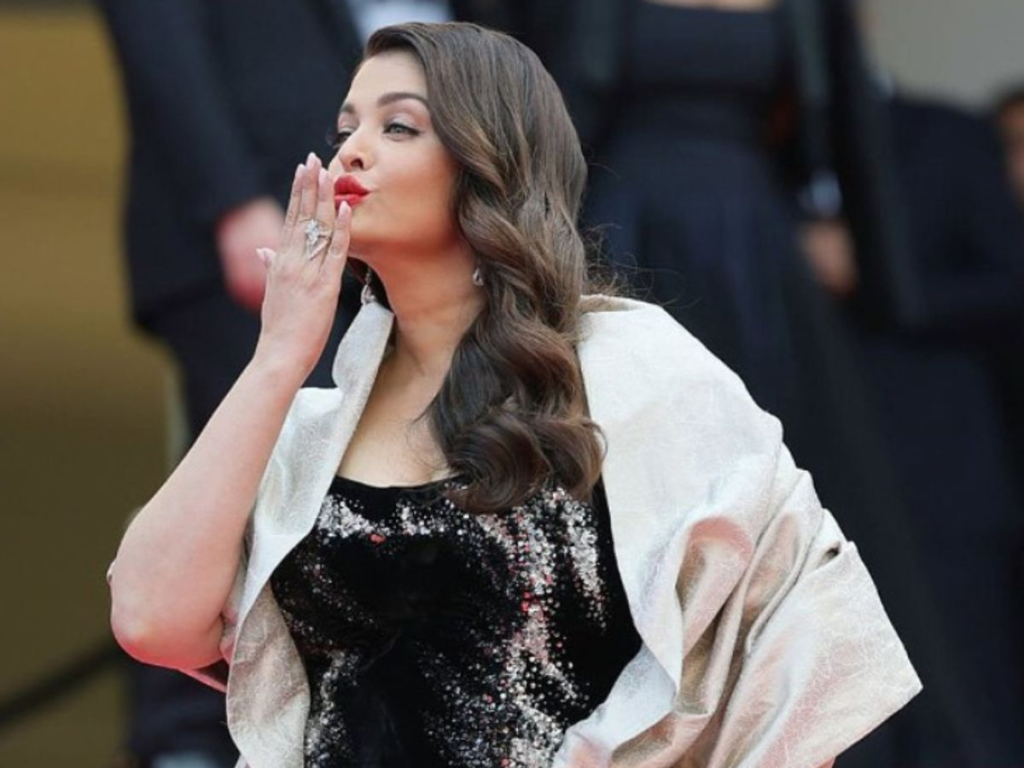 This marked Aishwarya’s second striking look at the French Riviera. On her first day, she wore a stunning ivory and gold saree by Manish Malhotra, layered with a sheer tissue dupatta featuring real gold and silver zardozi embroidery. She completed the look with a diamond and ruby necklace and a bold vermilion streak (sindoor) — a subtle yet powerful accessory that many online interpreted as a quiet rebuttal to swirling divorce rumors.