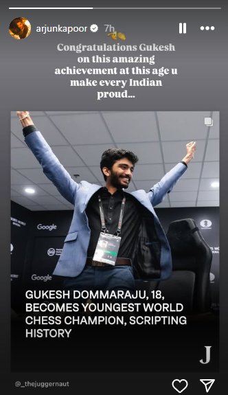 Actor Arjun Kapoor shared a heartfelt message on his Instagram stories, writing, “Congratulations Gukesh on this amazing achievement at this age you make every Indian proud.”