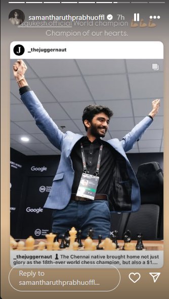 Actress Samantha Ruth Prabhu, known for her heartfelt social media posts, also congratulated the champion, writing, “World champion. Champion of our hearts.”