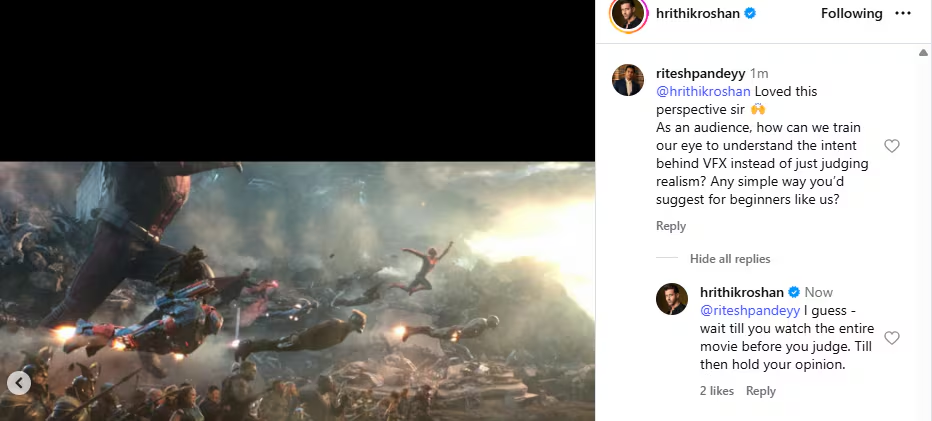 Reflecting on his own childhood obsession with Back to the Future, Hrithik praised the “noble” intent of creators behind VFX-heavy projects like Kalki 2898 AD, Baahubali, and the upcoming Ramayana. He emphasized that thousands of Indian artists work for years to bring these visions to life, suggesting that what some label as “bad VFX” might simply be a specific aesthetic choice intended for the story. “Wait till you watch the entire movie before you judge,” he replied to a fan on Instagram, while also playfully admitting that the release of unfinished VFX remains a “mystery” even to him.