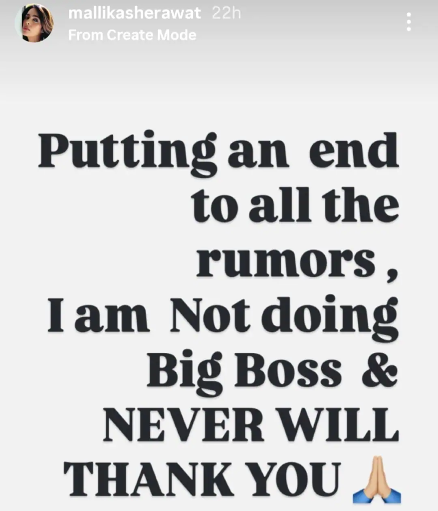 On Monday, Mallika Sherawat took to her Instagram Stories to address the swirling speculation, writing, “Putting an end to all the rumours, I am NOT doing Bigg Boss and NEVER WILL. THANK YOU.” This statement comes after she previously appeared as a guest on Bigg Boss 18 to promote her film Vicky Vidya Ka Woh Wala Video. Many Bollywood celebrities, including Sunny Leone, Shamita Shetty, and Pooja Bhatt, have participated in the show over the years.