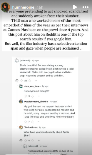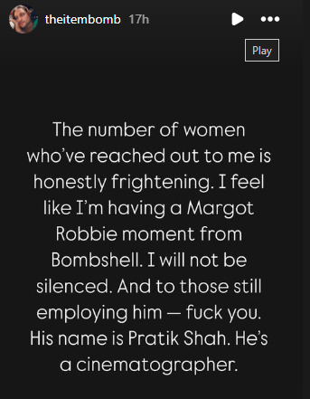 “The number of women who’ve reached out to me is honestly frightening… I will not be silenced… His name is Pratik Shah. He’s a cinematographer.”