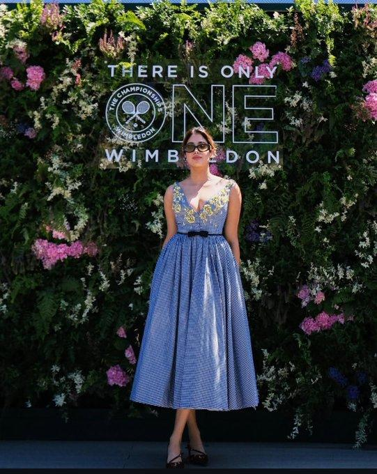 Janhvi turned heads in a checkered dress with floral embroidery, embodying summer sophistication with a sporty twist. Shikhar complemented her in a sharp blue suit, staying true to Wimbledon’s classic sartorial standards.