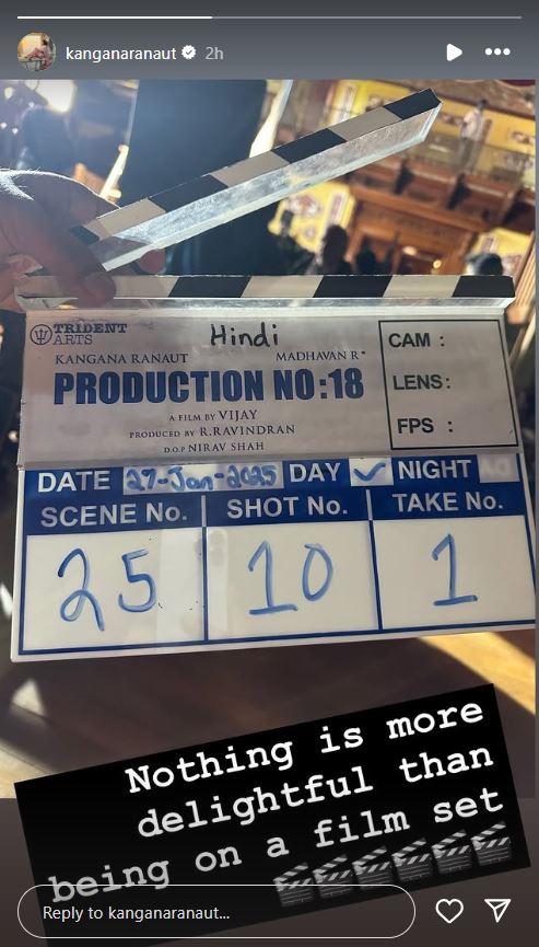 The movie, which will be directed by Vijay, known for his acclaimed work on the biographical drama Thalaivii, will be shot as a bilingual release in Hindi and Tamil. Kangana expressed her excitement about getting back to work on a film set, sharing her enthusiasm through an Instagram story featuring a clapperboard from the shoot, captioned with, “Nothing is more delightful than being on a film set.”