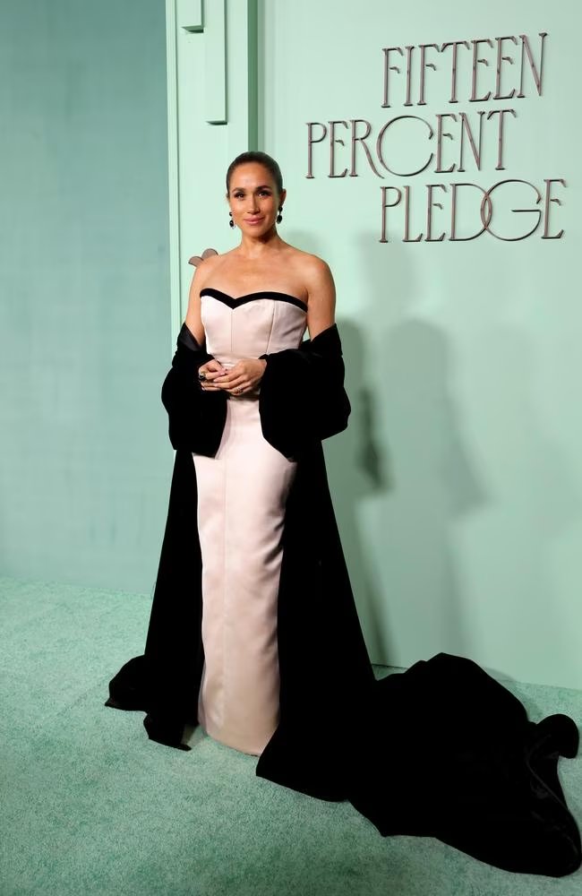 Adhering to the evening’s “Black Tie in Black Designers” dress code, Meghan opted for a custom look by LA-born luxury label Harbison Studio, founded by Charles Harbison.