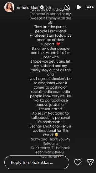 She admitted to being “too emotional for this world” and vowed to stop discussing her personal life publicly. Referring to the media’s tendency to create a “rai ka pahaad” (making a mountain out of a molehill), she assured her fans (NeHearts) that she would be back “with a bang.”