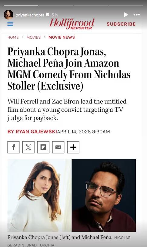 Sharing the news on her Instagram story, Priyanka posted a screenshot of the THR article, confirming her participation in the film.