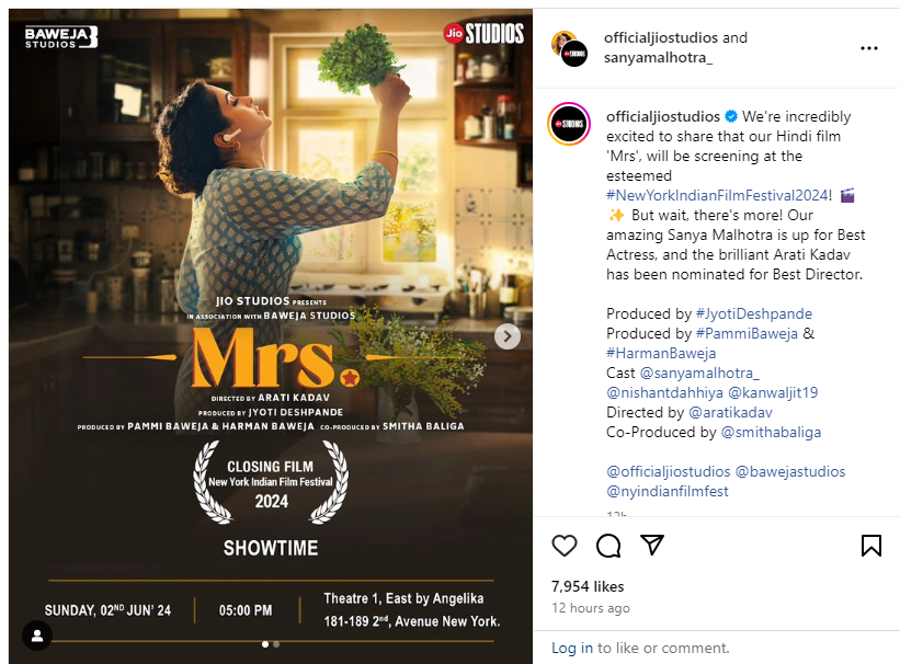 The exciting news was announced on Jio Studios’ official Instagram. “We’re incredibly excited to share that our Hindi film ‘Mrs’, will be screening at the esteemed #NewYorkIndianFilmFestival2024! But wait, there’s more! Our amazing Sanya Malhotra is up for Best Actress, and the brilliant Arati Kadav has been nominated for Best Director,” read the post.