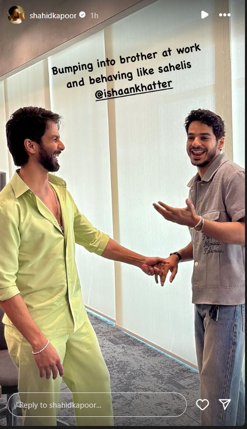 In the first image, Shahid is seen holding Ishaan’s hand while the two engage in a deep conversation. Shahid captioned the photo with a playful tone, writing, “Bumping into brother at work and behaving like sahelis @ishaankhatter.” The camaraderie between the two is evident in the snap, highlighting their close relationship.
