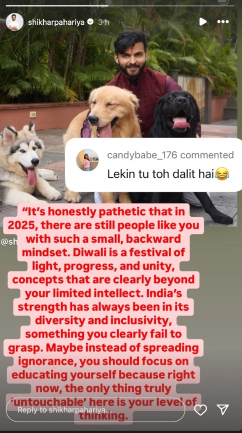 In his Instagram story, Shikhar wrote, “It’s honestly pathetic that in 2025, there are still people like you with such a small, backward mindset.” He added that the troll clearly didn’t understand the true essence of Diwali, a festival symbolizing light, progress, and unity.