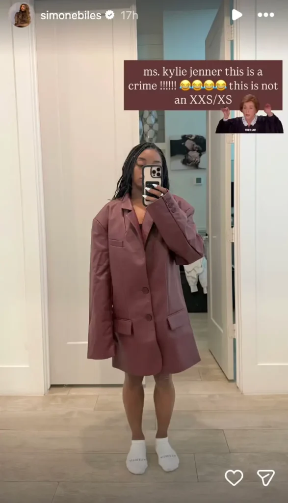 “Ms. Kylie Jenner this is a crime !!!!!!” Biles, 28, joked on her Instagram Story Wednesday, alongside a photo of herself in the deep red blazer. She followed it up with a meme-like comparison to supermodel Gigi Hadid donning an exaggeratedly large Vetements hoodie, quipping, “This is me on the last slide, SICK.”