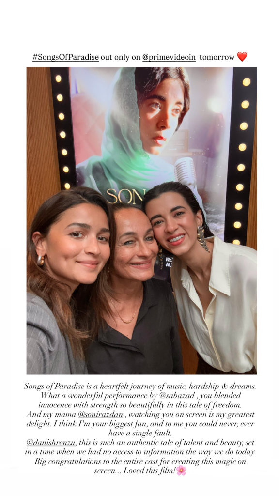 Alia Bhatt has penned a heartfelt review for her mother Soni Razdan and Saba Azad’s upcoming film, Songs of Paradise. The actress watched the movie at a special screening and praised the film’s touching narrative.