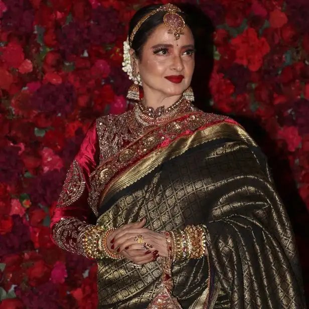 Veteran actress Rekha made an appearance, stunning the guests with her timeless elegance in a red and black saree.