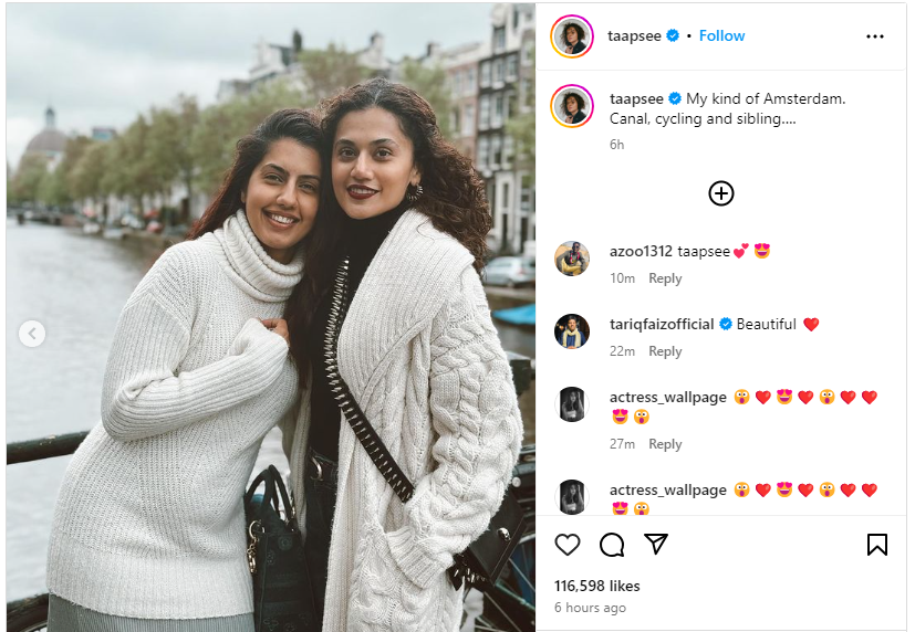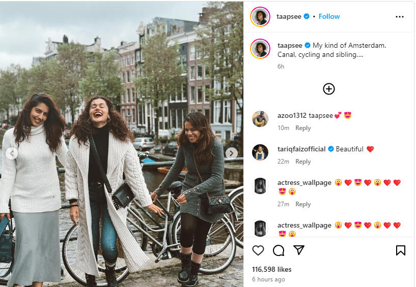 Canal, cycling and sibling….” In the snapshots, Taapsee exuded elegance in a long white jacket paired with a chic black outfit, while her sister Shagaun sported a stylish white winter ensemble.