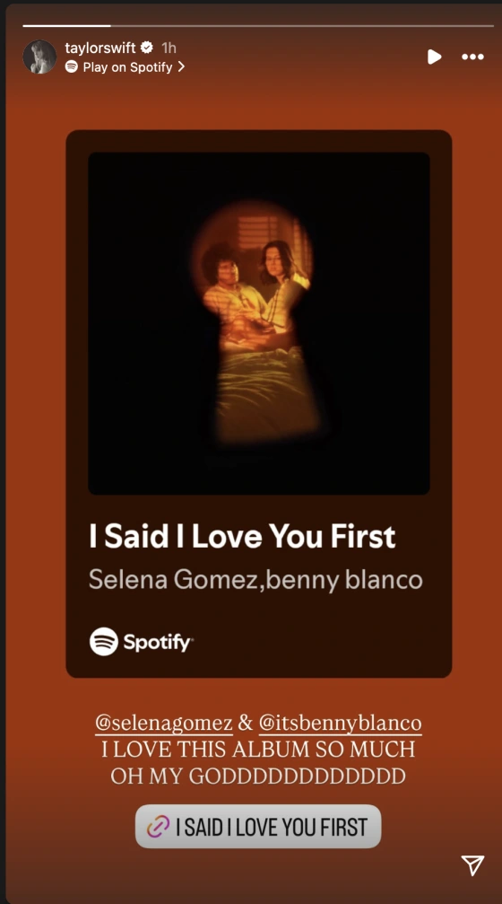 Swift, known for her close friendship with Gomez, took to her Instagram Stories to express how much she loved the album, sharing a link to it with the caption: “@selenagomez & @itsbennyblanco I LOVE THIS ALBUM SO MUCH. OH MY GODDDDDDDDDDDD.”