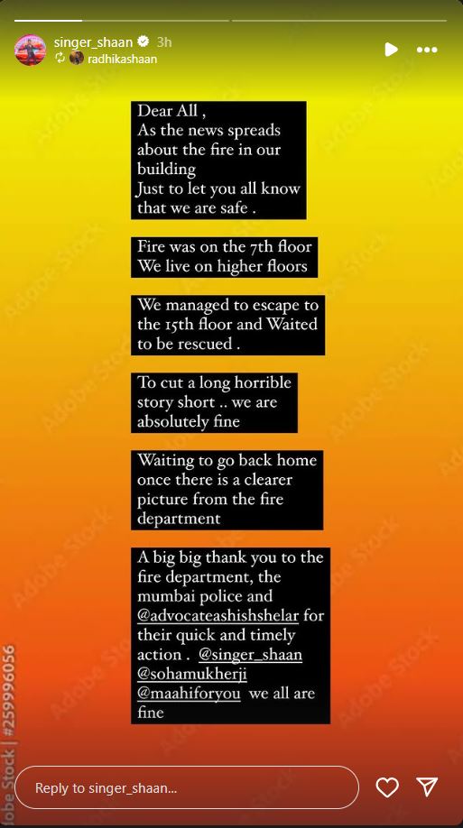 December 24, 2024: Singer Shaan has reassured his fans about his safety after a massive fire broke out at his Bandra residence on Tuesday. The fire, which started on the seventh floor of a multi-storey building, prompted a swift response from the fire department.