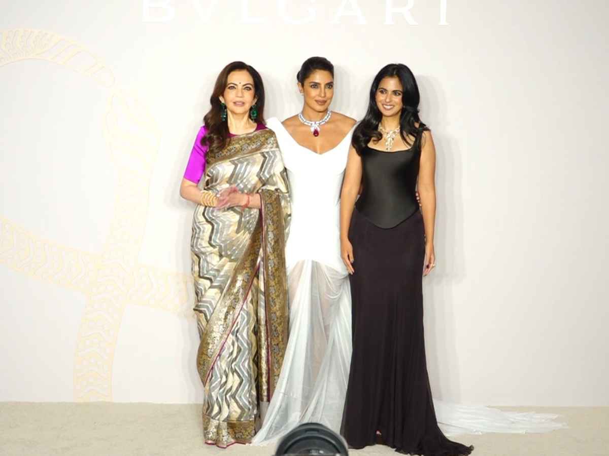 Nita Ambani embodies timeless luxury in a Swadesh Pachrangi saree paired with a rare Serpenti bracelet at the NMACC. Isha Ambani brings high-fashion drama in an Ashi Studio gown and a show-stopping Bvlgari Rose Gold Serpenti necklace.
