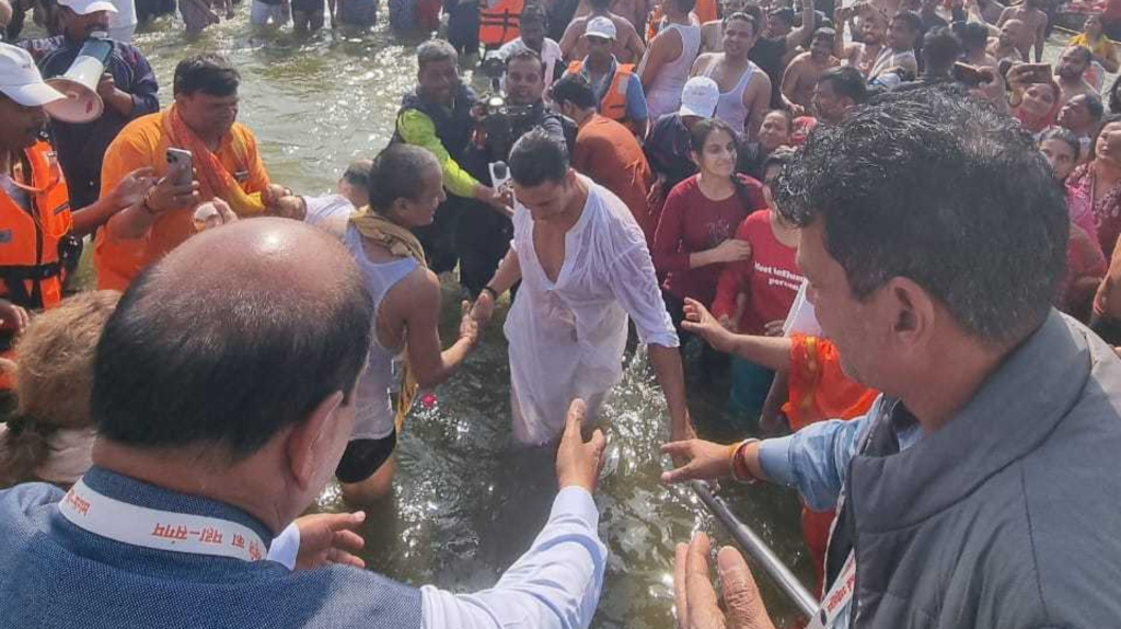 The actor was seen folding his hands in prayer before entering the holy waters. Drenched head to toe, he was greeted by fans and devotees, shaking hands before stepping out of the river.