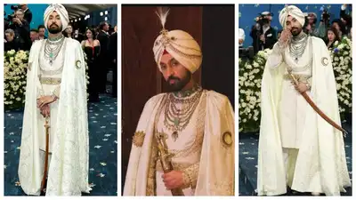 Diljit stunned in a Prabal Gurung outfit that honoured his Punjabi heritage. Though denied the original Patiala necklace, he dazzled with layered pearl, emerald, and diamond jewellery that echoed royal opulence.