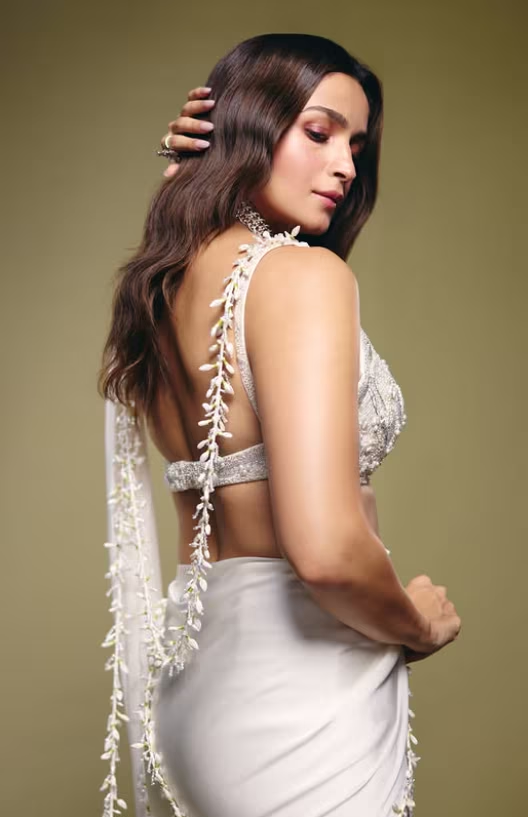 Earlier in the evening, Alia embraced a more traditional look in a custom saree by the same designer. The ensemble featured intricate beadwork resembling delicate vine patterns, creating a fluid and ethereal effect. Paired with a heavily embellished blouse and layered diamond jewellery, the look bridged heritage craftsmanship with modern styling.
