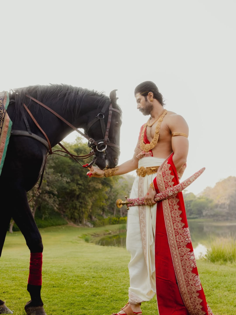 One of his standout appearances featured a white dhoti paired with a crimson zari-detailed sash, elevated with heavy gold jewellery including necklaces, armbands, and a kamarbandh. The look drew inspiration from royal and warrior traditions, highlighting grandeur and confidence.