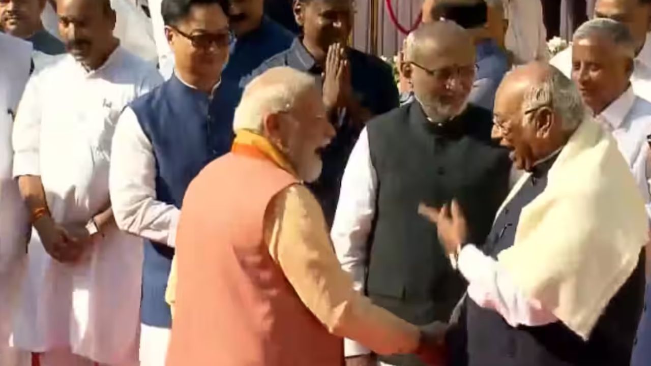 April 14, 2026: A rare light-hearted moment between Narendra Modi and Mallikarjun Kharge caught attention as leaders gathered at Prerna Sthal to pay tribute to B R Ambedkar on his 135th birth anniversary. The two leaders were seen greeting each other warmly, exchanging smiles and a brief conversation, offering a glimpse of camaraderie amid otherwise intense political rivalry.