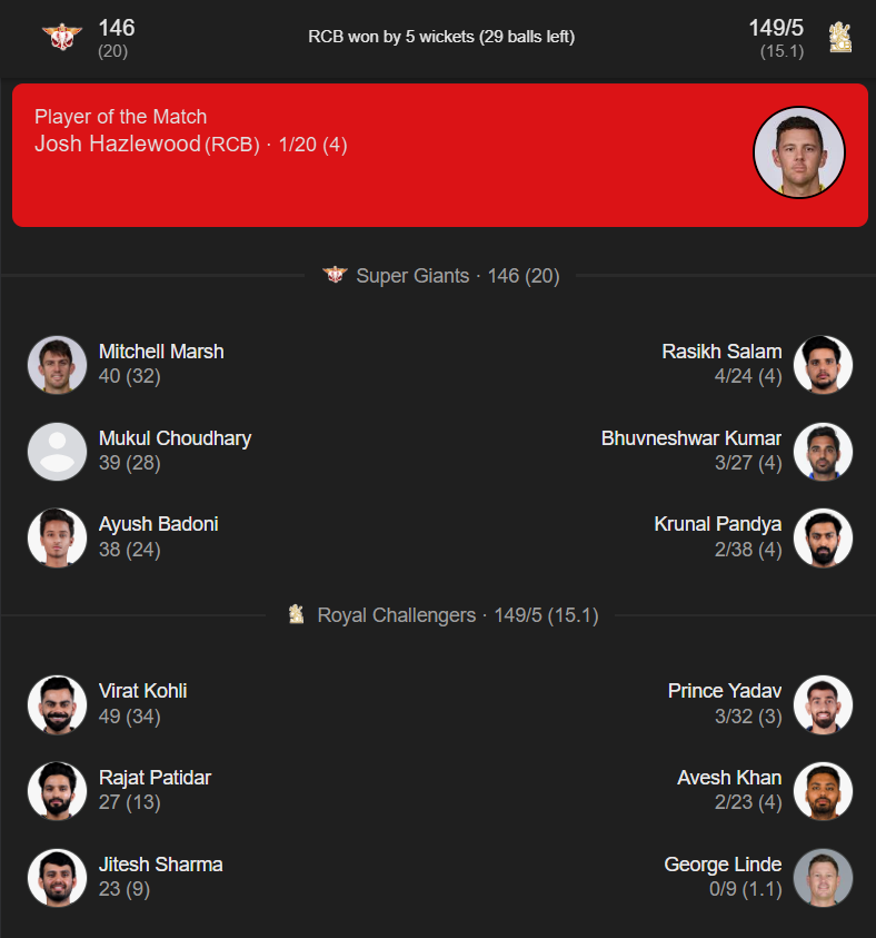 With their fourth win in five games, RCB move to 1st place on the basis of a superior Net Run Rate (NRR). LSG, conversely, slip further down the table with their third defeat in five outings, raising questions about their middle-order form and the availability of Rishabh Pant for the upcoming fixtures.