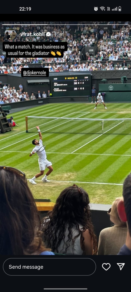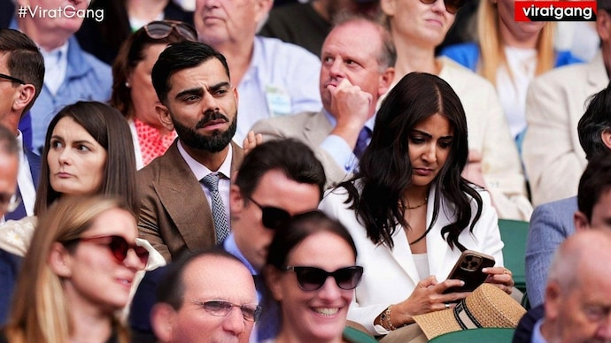 Star couple Virat Kohli and Anushka Sharma were spotted in the stands of Centre Court at Wimbledon 2025, cheering for tennis great Novak Djokovic during his intense Round of 16 clash against Australia’s Alex de Minaur. Their presence quickly set social media abuzz, with viral photos showing the cricketer-actor duo enjoying the match and Kohli even referring to Djokovic as a “Gladiator.”