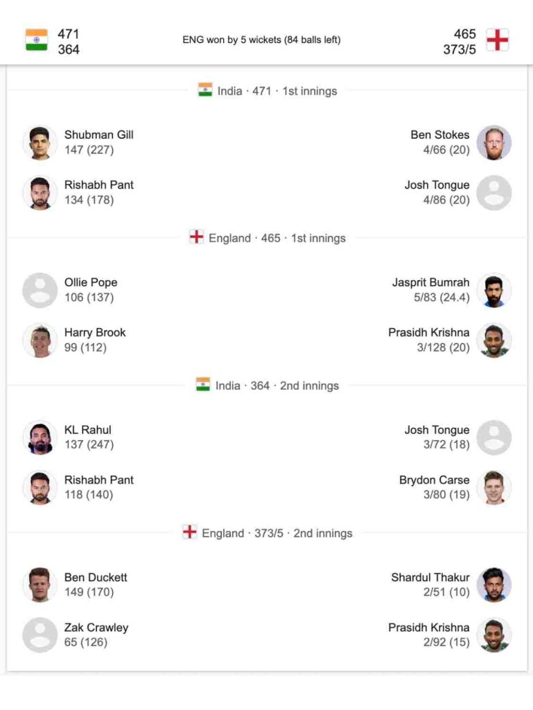 England (465 & 373/5) defeated India (471 & 364) by 5 wickets.