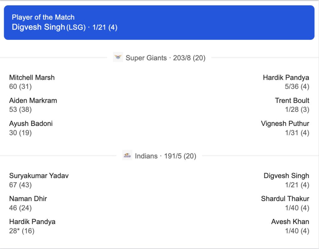 With this win, LSG continue their solid start to the season, while MI’s inconsistency raises questions ahead of their next clash.
