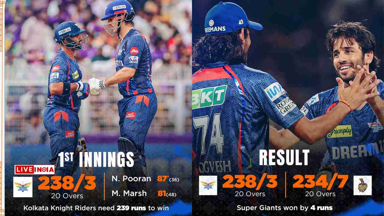 Nicholas Pooran’s unbeaten 87 and Mitchell Marsh’s explosive 81 set up Lucknow Super Giants’ thrilling 4-run win over Kolkata Knight Riders in a 472-run epic at Eden Gardens.