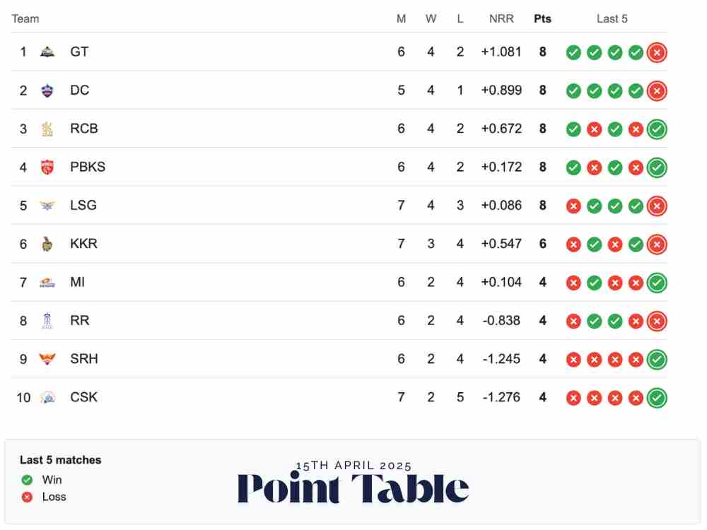 - PBKS 111 (15.3): Prabhsimran Singh (30), Priyansh Arya (22); Harshit Rana (3/25), Narine (2/14)