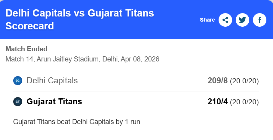 The Delhi Capitals fell agonisingly short by just one run against the Gujarat Titans in a thrilling high-scoring encounter during the Indian Premier League 2026 season at the Arun Jaitley Stadium on Tuesday.