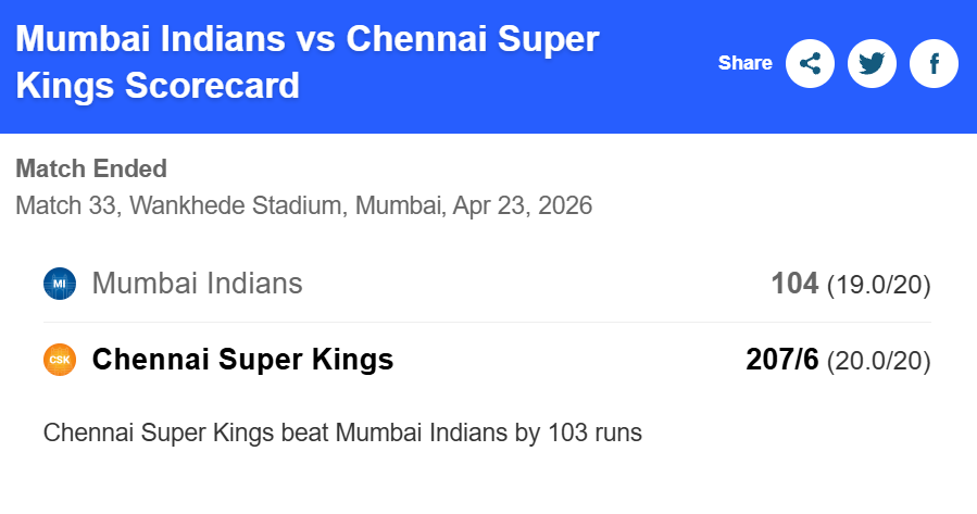The 103-run victory marks one of Chennai Super Kings’ most dominant wins against Mumbai Indians in IPL history and highlights the team’s all-round strength in both batting and bowling departments.