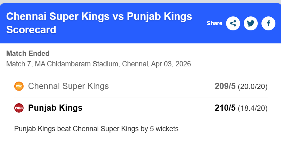 Chasing 210 in Chennai is never easy, but PBKS showed composure and intent throughout their innings. The batters maintained a steady scoring rate and handled pressure situations effectively to seal the win with wickets in hand.