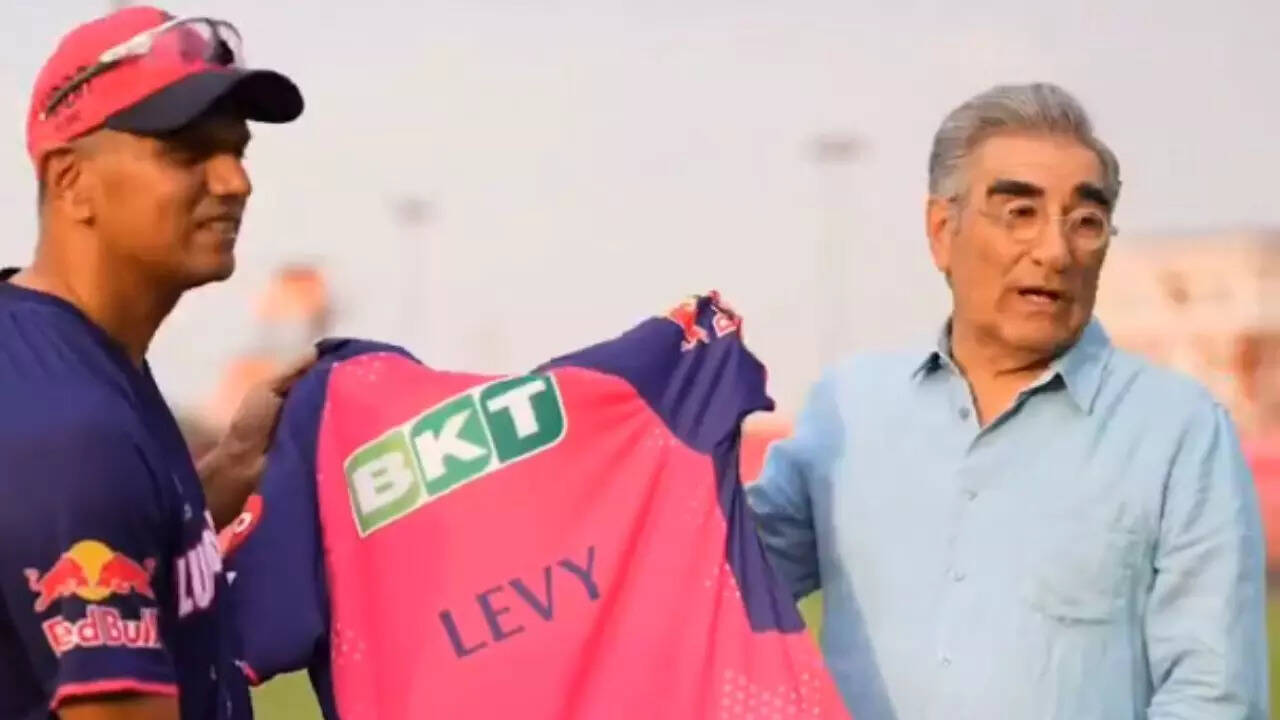 “Now that you’re a Rajasthan Royals fan, we’ve got a special t-shirt for you,” Dravid told Levy in the video. The Royals captioned the video, “Schitt just got real! Eugene Levy is a Royal.”