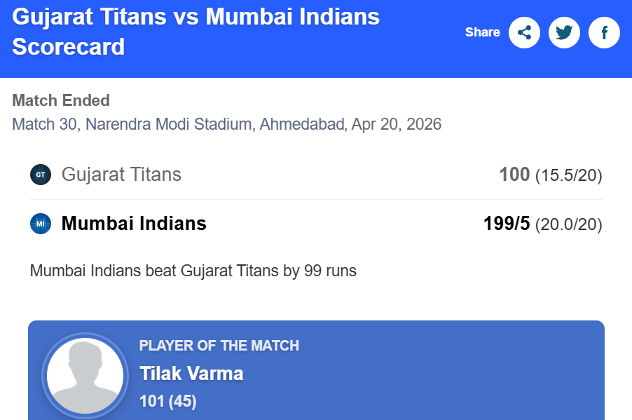 Mumbai Indians produced a dominant all-round performance to thrash Gujarat Titans by 99 runs in their Indian Premier League 2026 clash in Ahmedabad on Monday, with Tilak Varma delivering a sensational century to headline the victory.