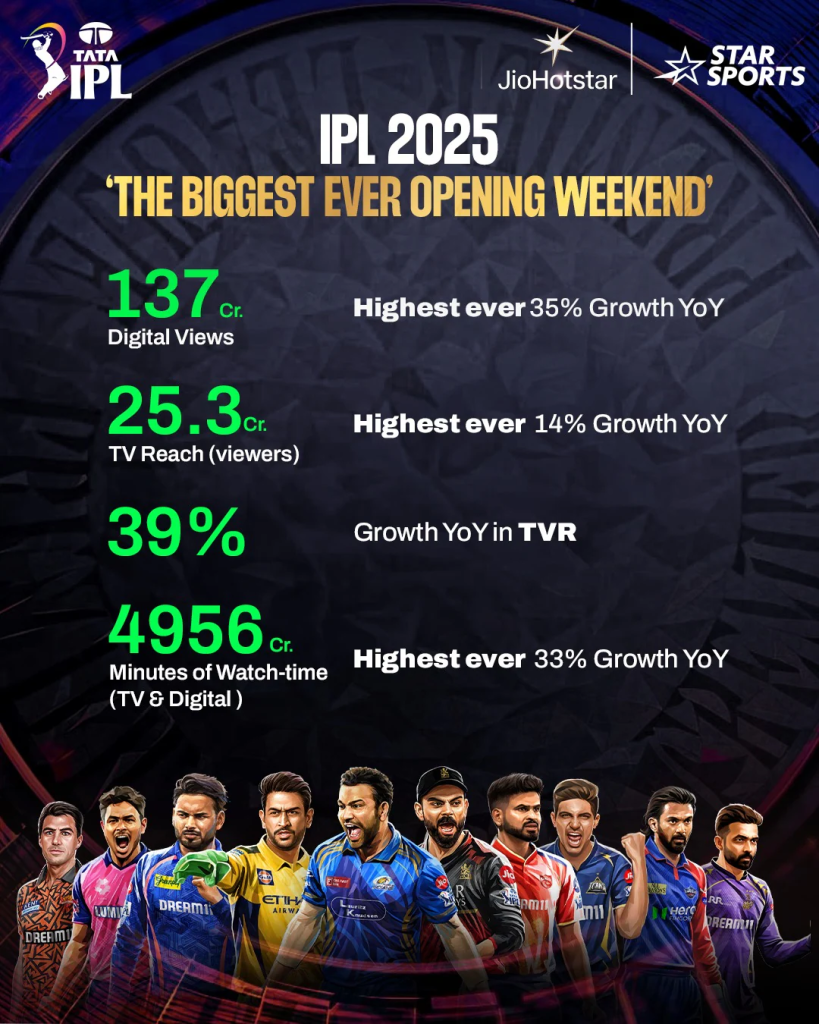 On the television front, the opening weekend also set new records. According to BARC data, over 25.3 crore viewers tuned in for the first three matches of IPL 2025, generating a staggering 2,770 crore minutes of watch time, marking a 22 percent increase over the previous season. The average TV Rating (TVR) for these matches was up by 39 percent from last year, showing a significant rise in audience engagement and viewership.