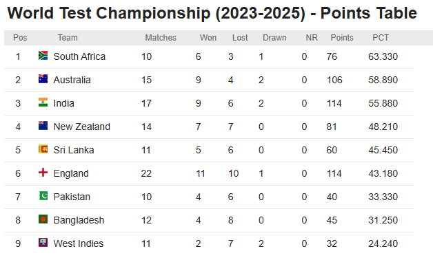 South Africa, leading the standings with a 63.33% points percentage, is currently in the box seat to secure a place in the WTC final. The remaining two spots for the final will likely come down to a contest between India and Australia.