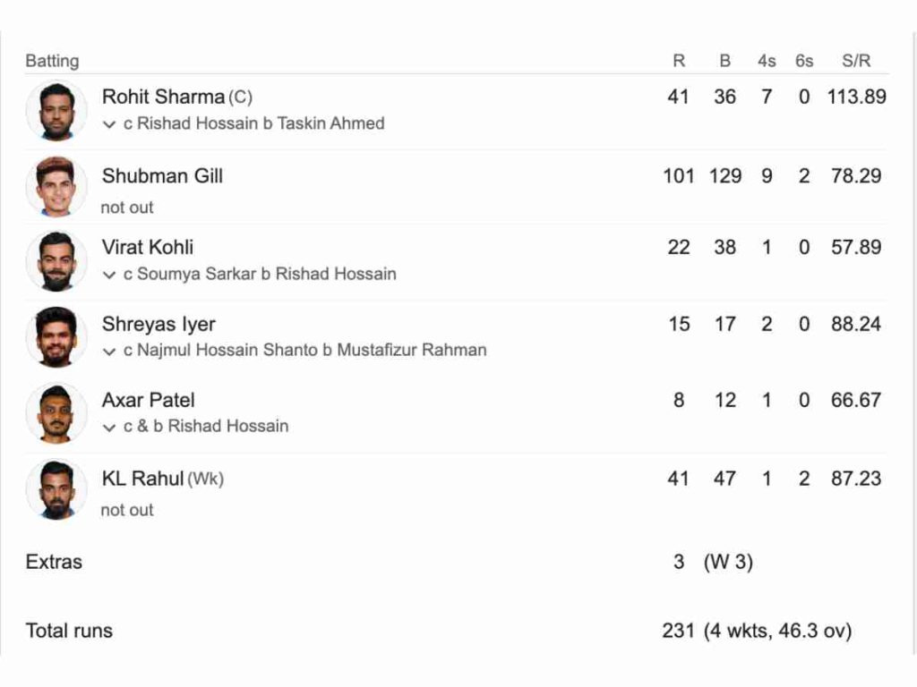 In the chase, India got off to a solid start, with Rohit Sharma (41 off 36) and Shubman Gill adding 69 runs for the first wicket. After a few hiccups in the middle overs, Gill (101 off 129)* and KL Rahul (41 off 47)* guided India home comfortably in 47.3 overs.
